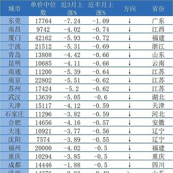 从近半月涨幅看:样本二线城市中,东莞(-1.09%)、南昌(-0.74%)、厦门(-0.72%)等城市房价跌幅相对较大,杭州(-0.26%)、哈尔滨(-0.34%)、西安(-0.35%)等城市房价跌幅较小。