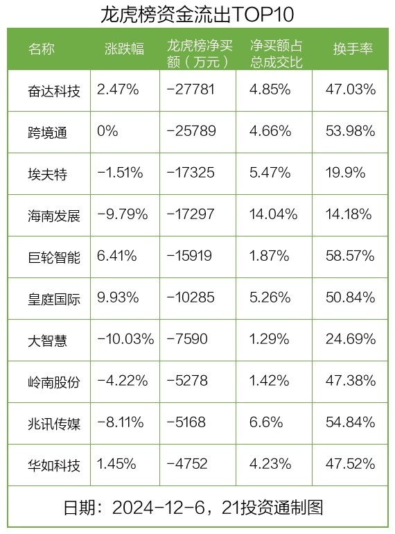 而龙虎榜中资金净流出最多的是奋达科技(002681.SZ),被净卖出为2.78亿元,占总成交金额的4.85%。奋达科技收盘上涨2.47%,换手率为47.03%。