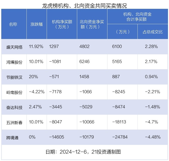 值得注意的是,机构和北向资金共同净买入了盛天网络等1股;共同净卖出了岭南股份、奋达科技、五洲新春、跨境通等4股;在鸿博股份,节能铁汉上出现分歧,机构净卖出鸿博股份1080.76万元,北向资金净买入6245.82万元;机构净卖出节能铁汉571.28万元,北向资金净买入1457.85万元。