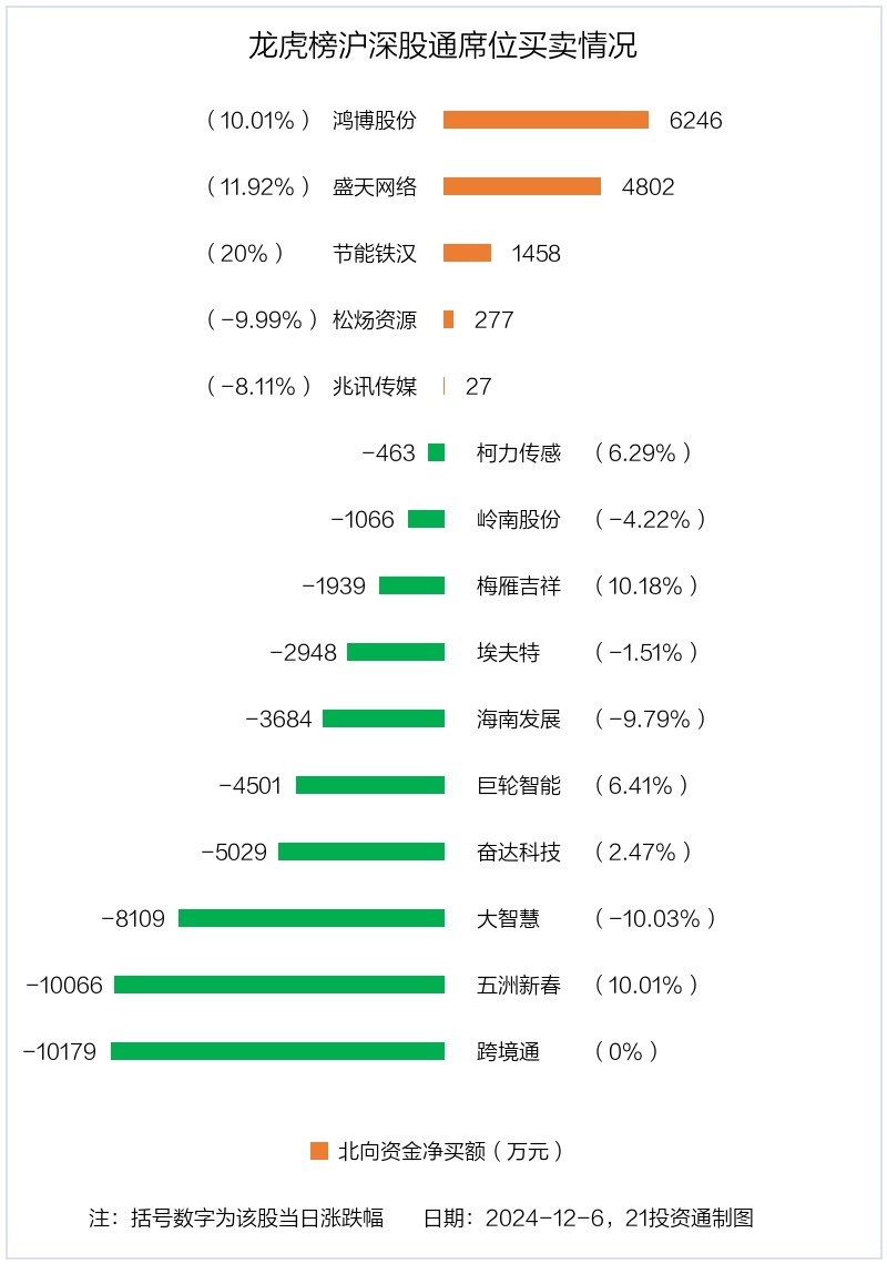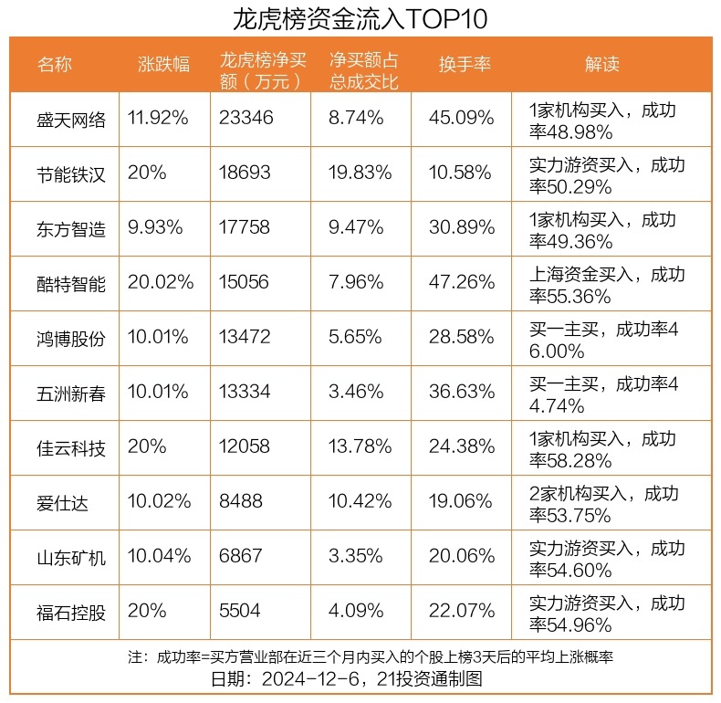 12月6日,上证指数上涨1.05%,深证成指上涨1.47%,创业板指上涨2.05%。盘后龙虎榜数据显示,共有56只个股因当日异动登上龙虎榜,资金净流入最多的是盛天网络(300494.SZ),达2.33亿元。