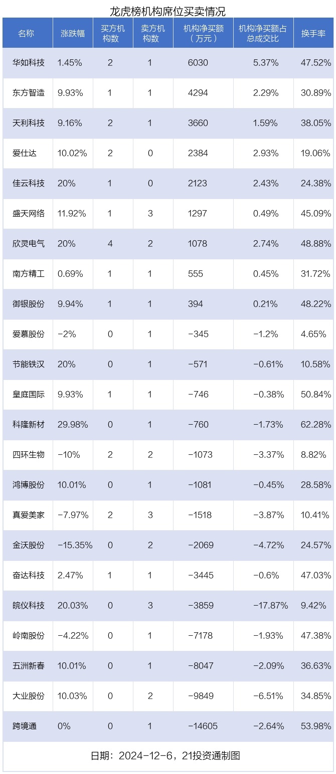 其中,机构净买入金额最多的是华如科技(301302.SZ),当日收盘上涨1.45%,换手率为47.52%。